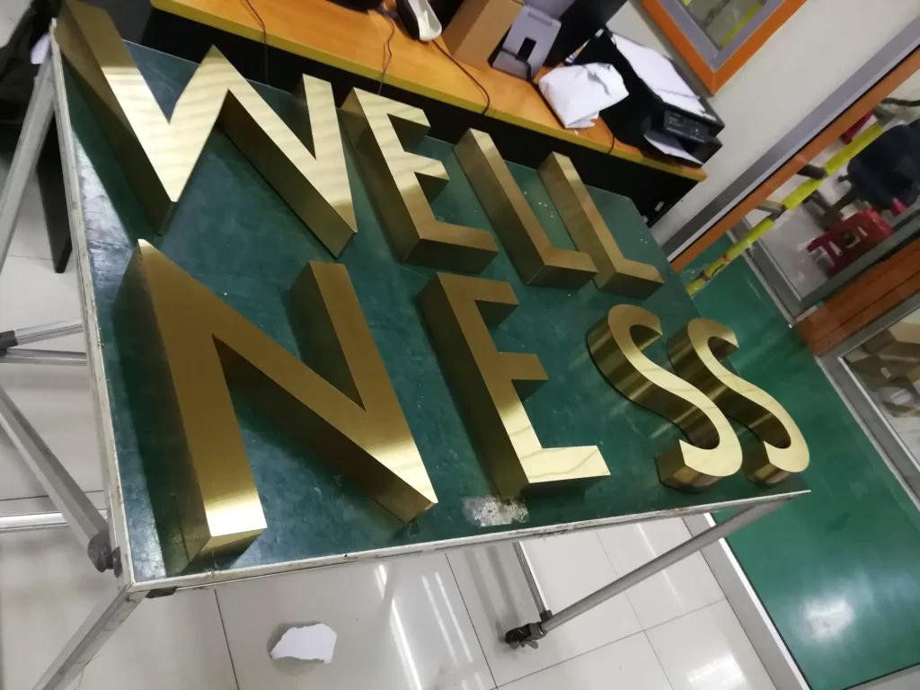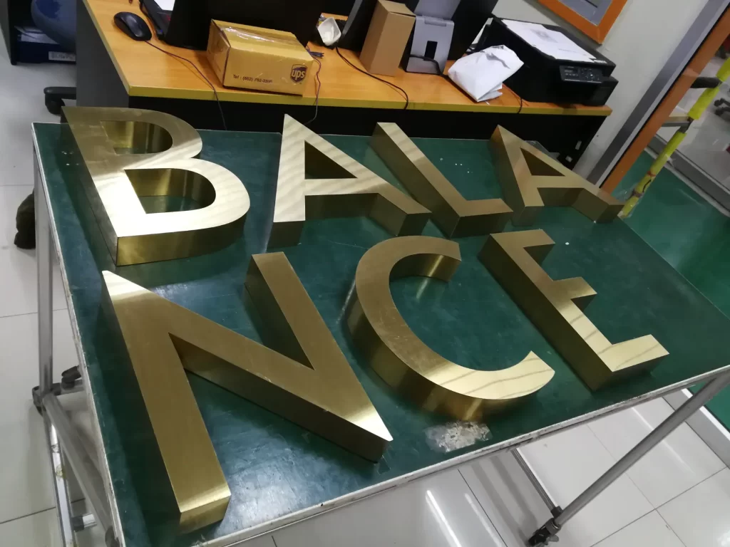 ผลิต และ ติดตั้ง ตัวอักษรนูนไฟออกหน้าและใช้วัสดุสแตนเลสหน้าทองผิว Hairline เพื่อให้ดูมีความทันสมัยและหรูหรา