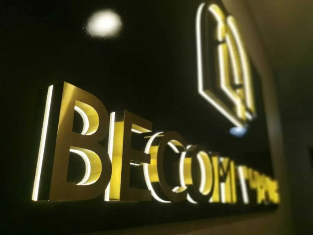ผลิต และ ติดตั้ง ตัวอักษรสแตนเลสผิว Hairline และ สแตนเลสหน้าสีดำผิว Hairline ยกขอบ พร้อมซ่อนไฟ LED ออกหลัง สร้างภาพลักษณ์ที่หรูหราและน่าเชื่อถือ