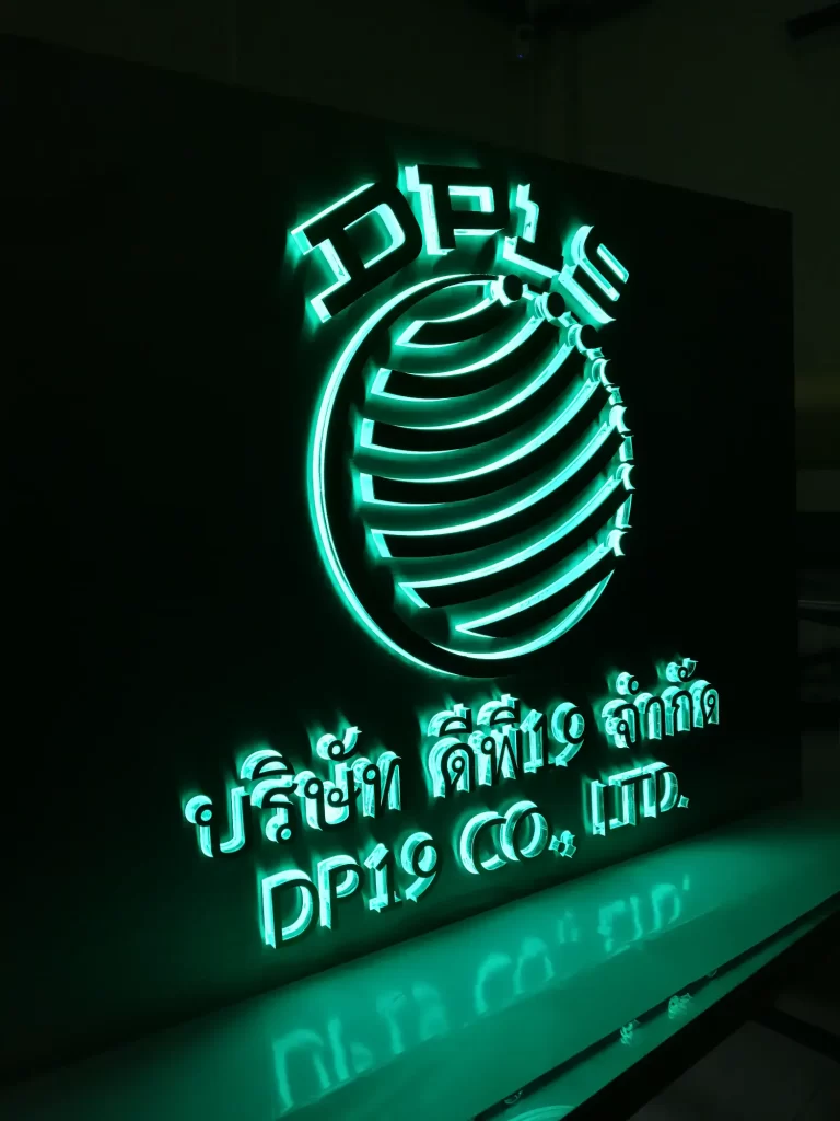 ป้ายอักษรที่ติดระบบไฟ LED ไว้ด้านหลังเพื่อสร้างเงาแสงที่ผนัง ช่วยเพิ่มความพรีเมียมและความลุ่มลึกให้กับแบรนด์ เหมาะกับองค์กรที่เน้นภาพลักษณ์ทันสมัย