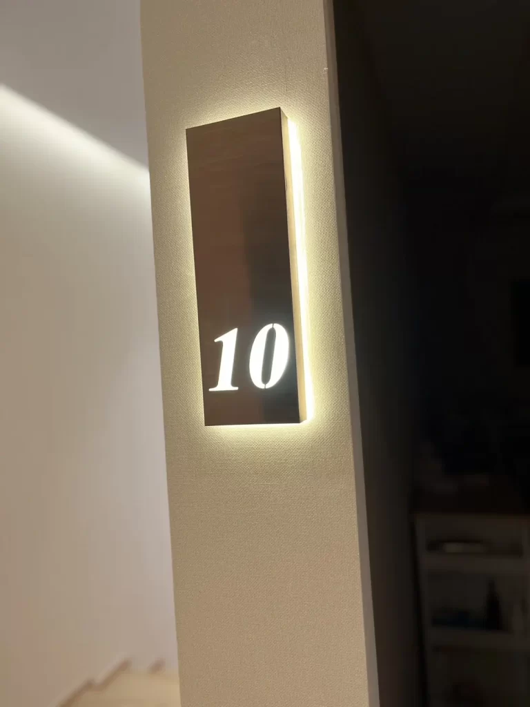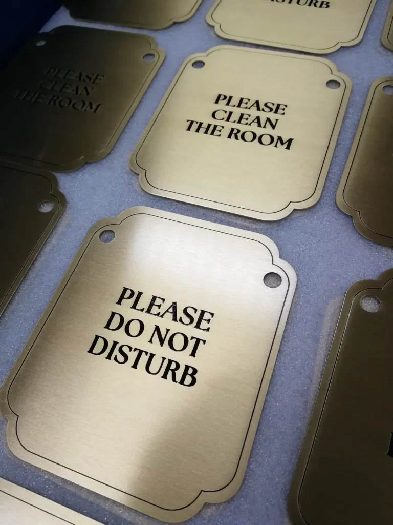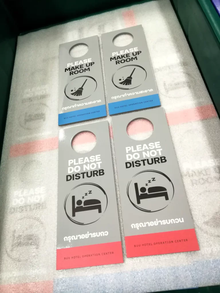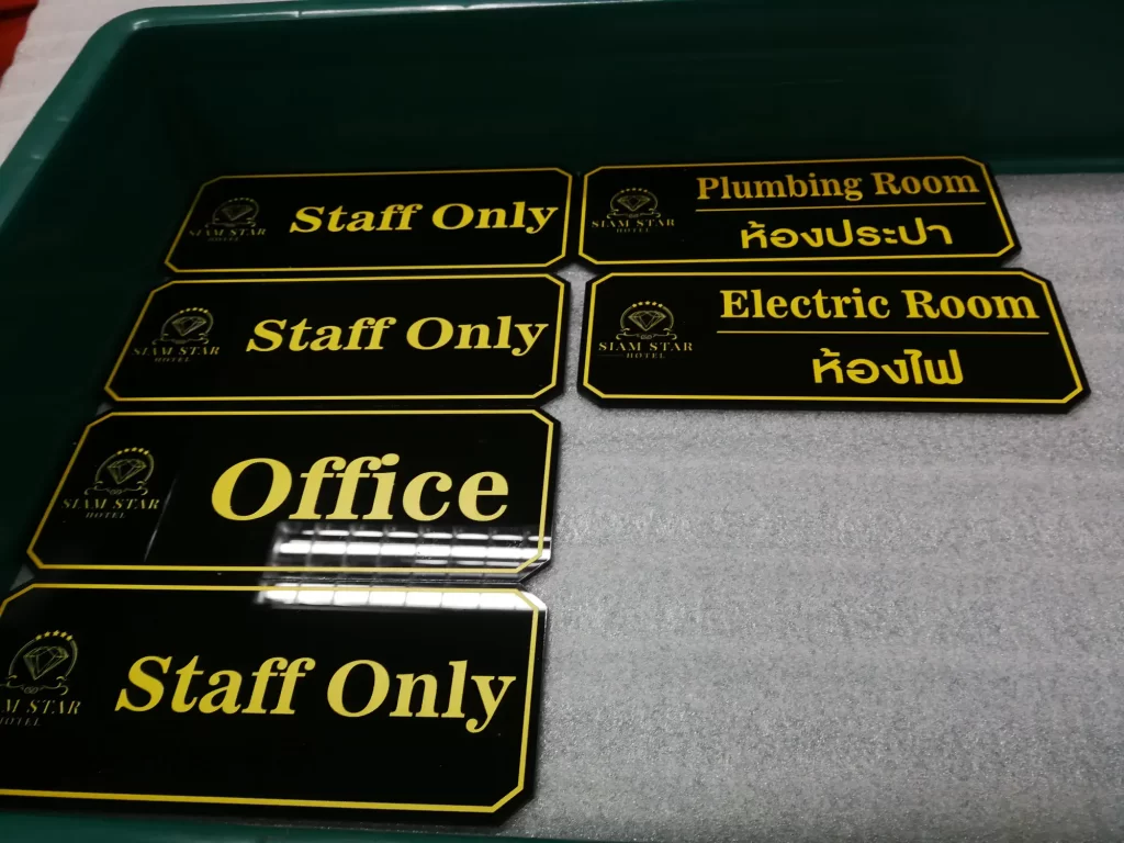 ป้ายที่ติดบริเวณหน้าห้องพัก ห้องประชุม หรือห้องบริการต่าง ๆ ภายในโรงแรม เช่น “ห้องพัก 201”, “ห้องประชุมมรกต”, หรือ “Business Center” เพื่อช่วยในการระบุตำแหน่งห้องอย่างชัดเจน เพิ่มความสะดวกให้ผู้เข้าพักและผู้มาติดต่อ