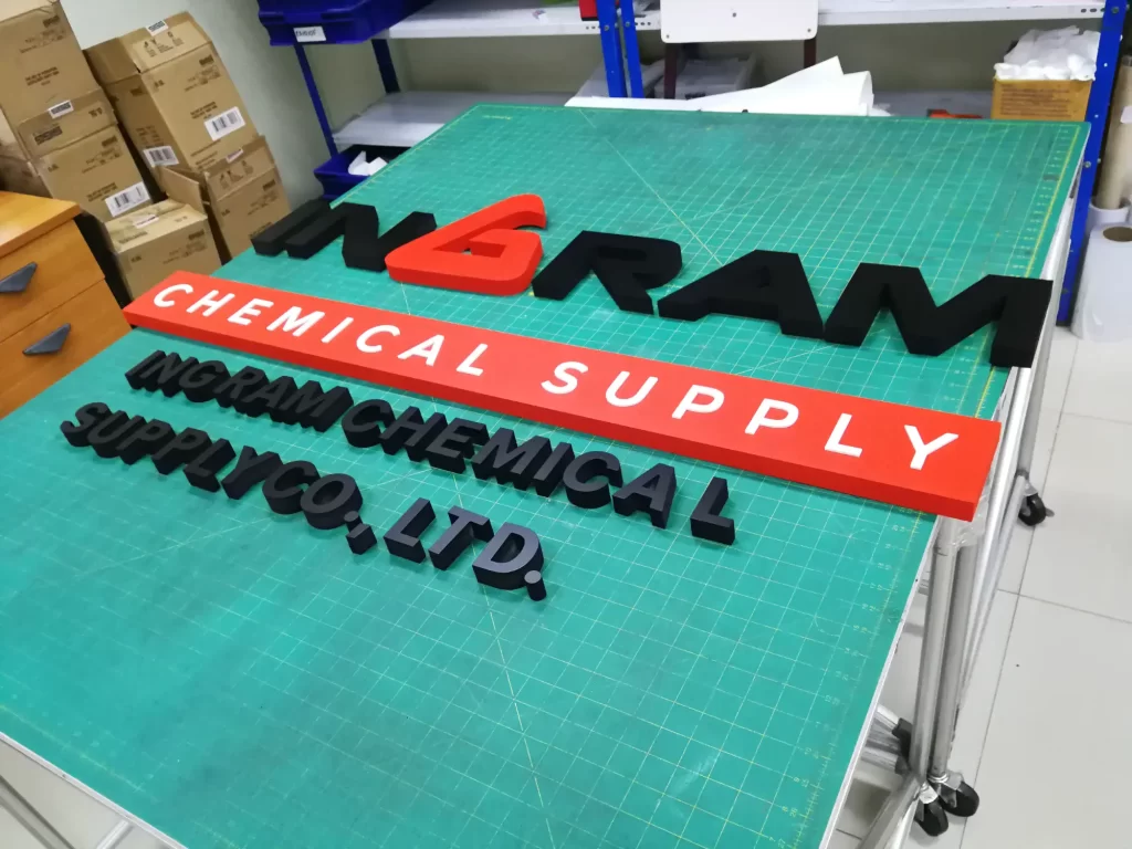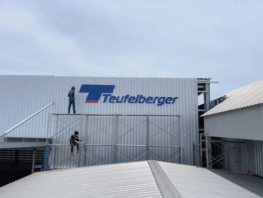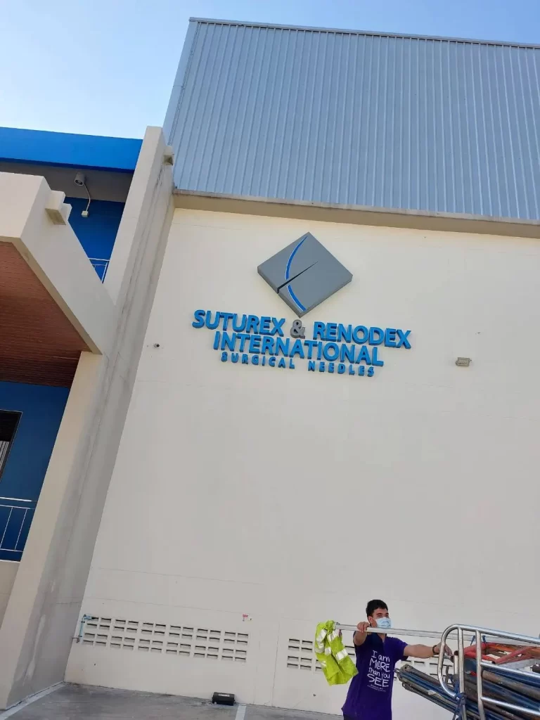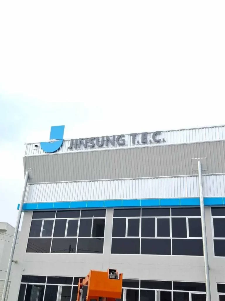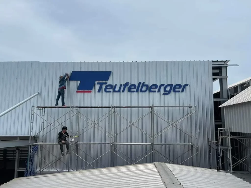 ใช้ตัวอักษรนูนแยกชิ้น ติดตั้งบนโครงเหล็กหรือผนังโรงงาน เพิ่มความโดดเด่น ดูทันสมัย
