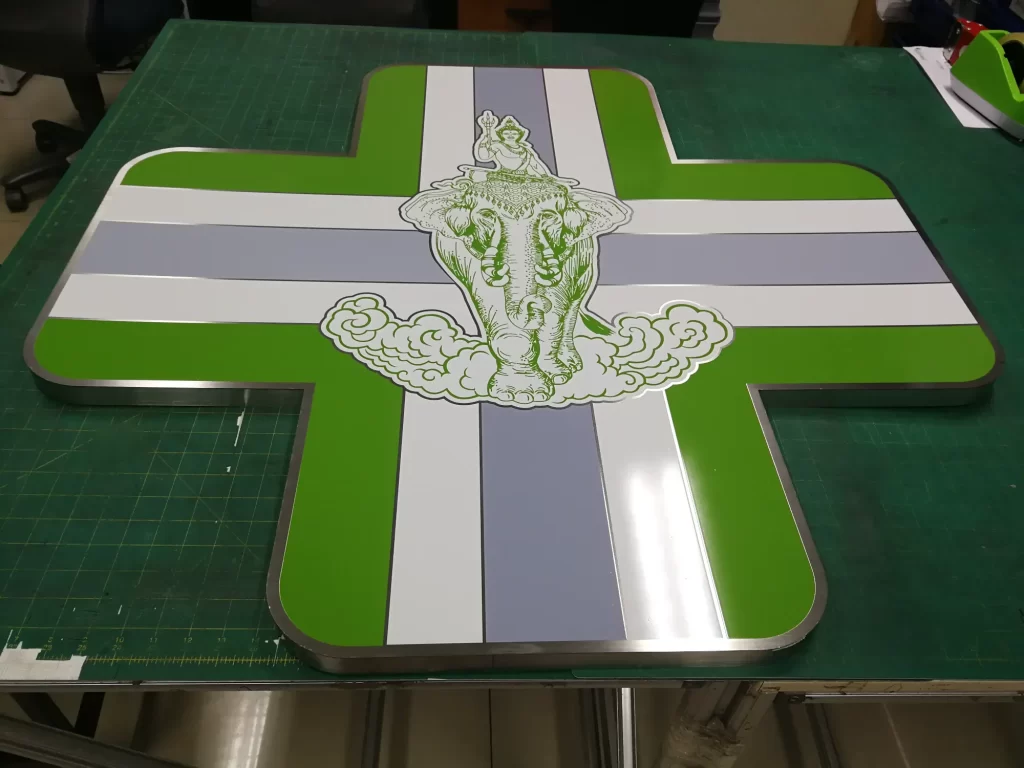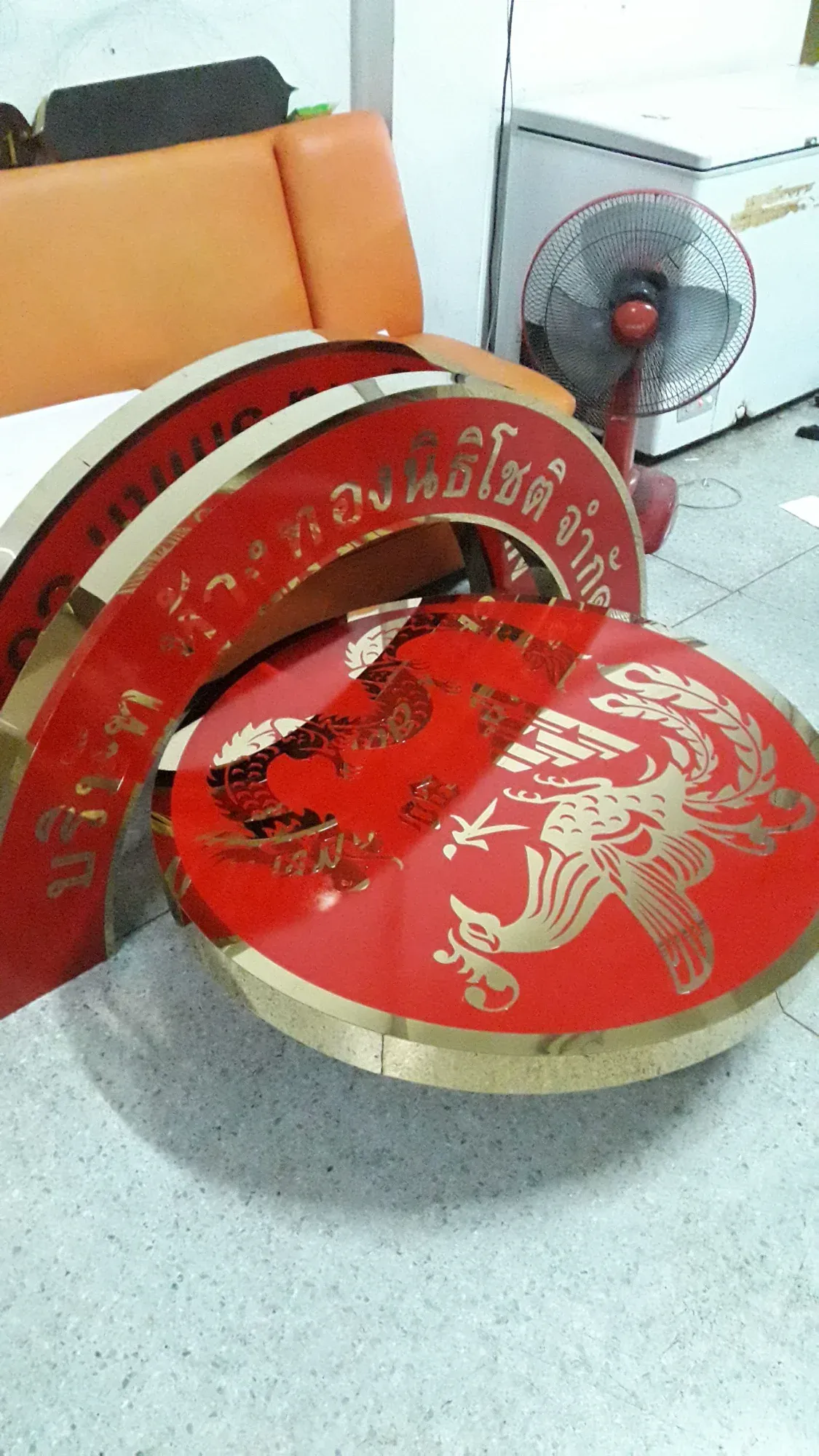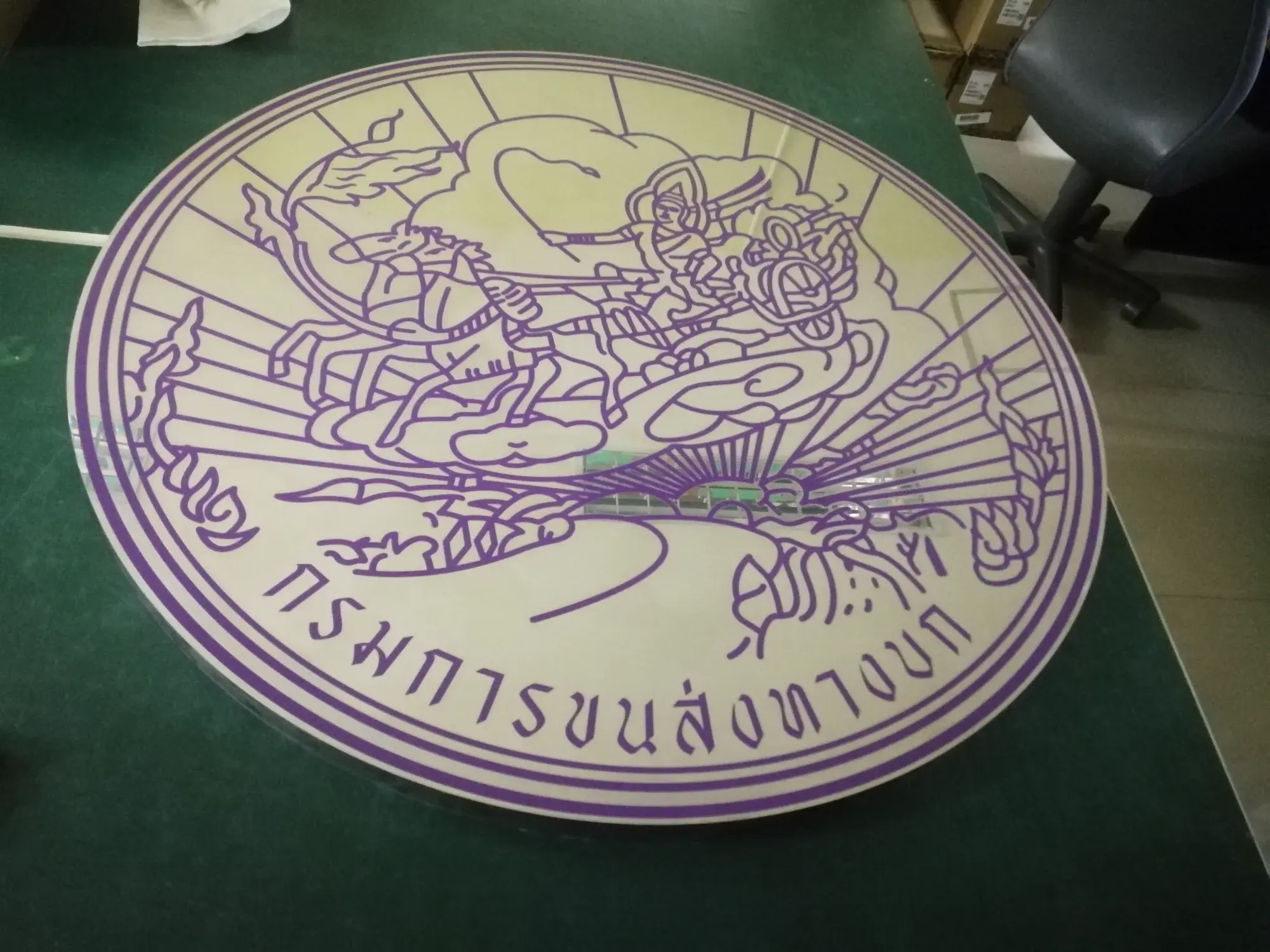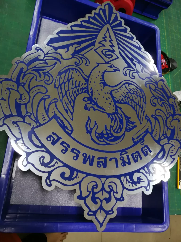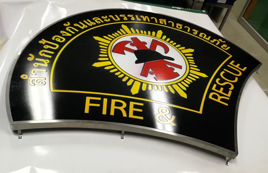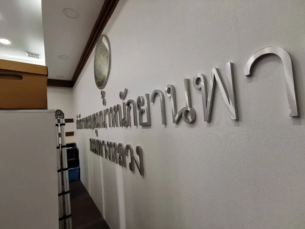 นิยมติดตั้งหน้าสำนักงานหรือหน้าอาคาร โดยใช้เทคนิคตัดโลโก้และอักษรให้ลอยจากพื้นหลังแบบเรียบ