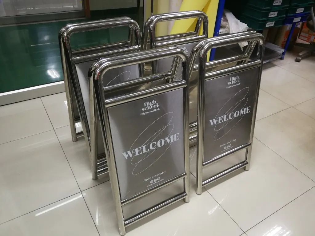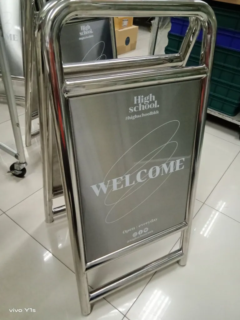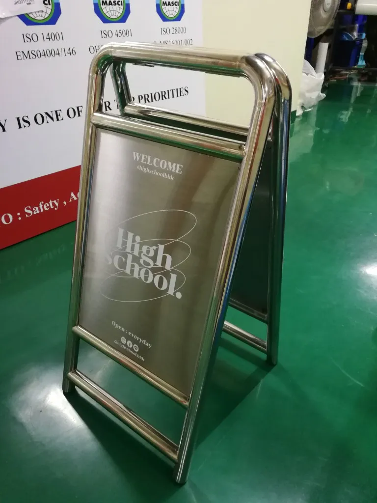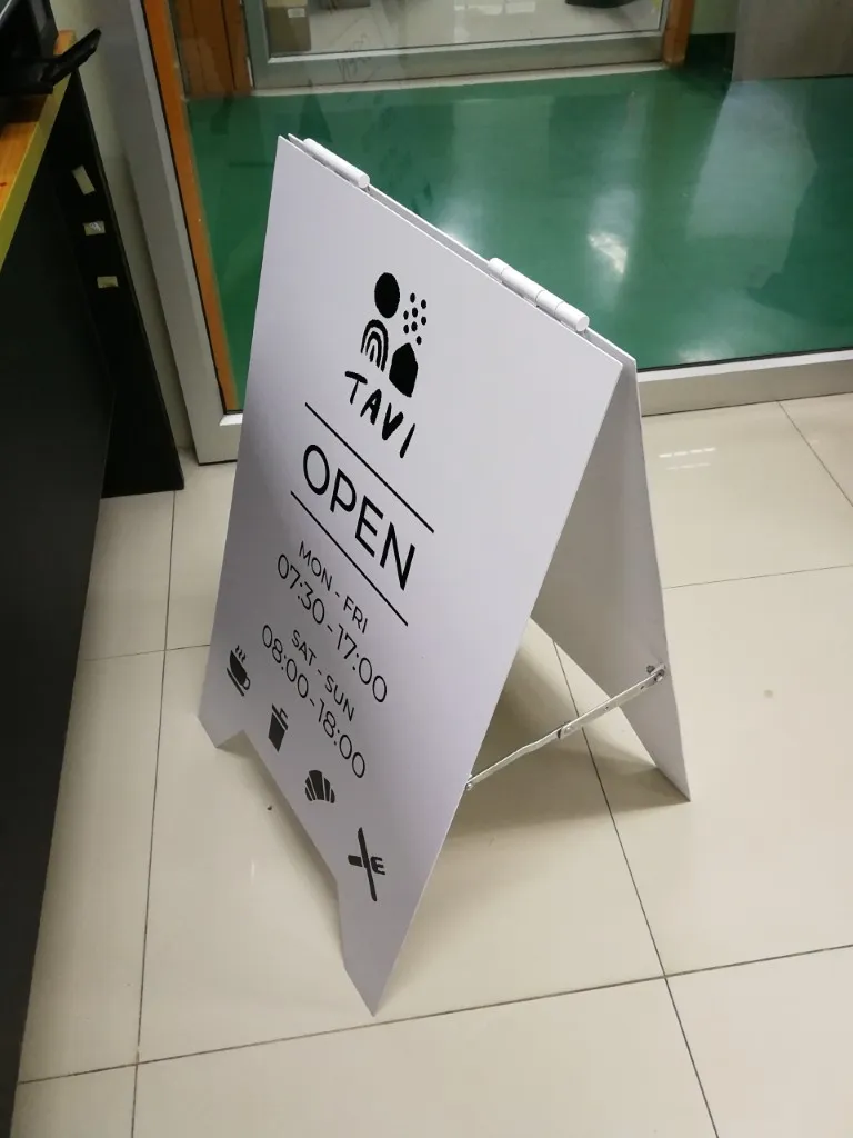 ดีไซน์แบบพกพาและพับได้ เหมาะสำหรับการโปรโมชั่นบนทางเท้า ป้ายบอกทางในงาน หรือประกาศชั่วคราว ติดตั้งและย้ายตำแหน่งได้ง่าย มีแผ่นกราฟิกที่เปลี่ยนได้หรือพื้นผิวที่เขียนได้สำหรับการอัปเดตรายวัน เหมาะสำหรับใช้ทั้งในร่มและกลางแจ้งที่มีหลังคา