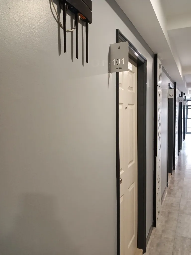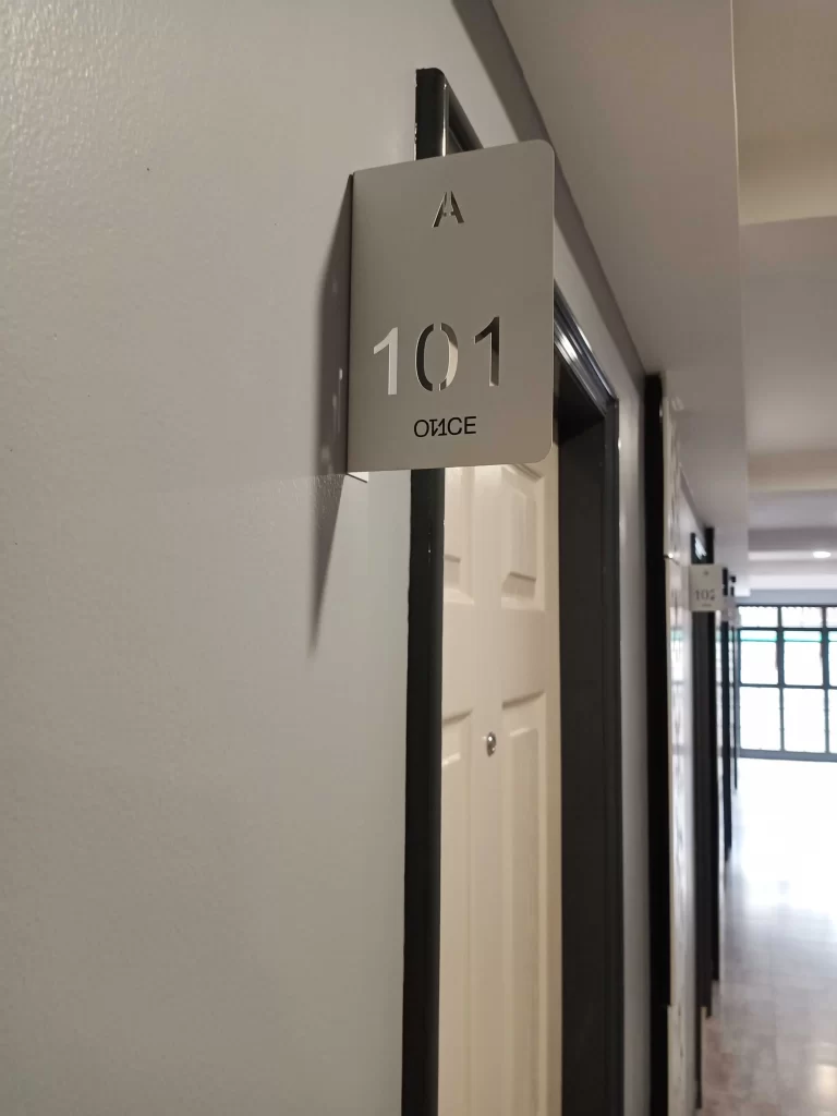 ชมตัวอย่างป้ายชื่อห้องและป้ายห้องน้ำที่ติดตั้งอย่างชัดเจน ช่วยให้การนำทางเป็นเรื่องง่าย