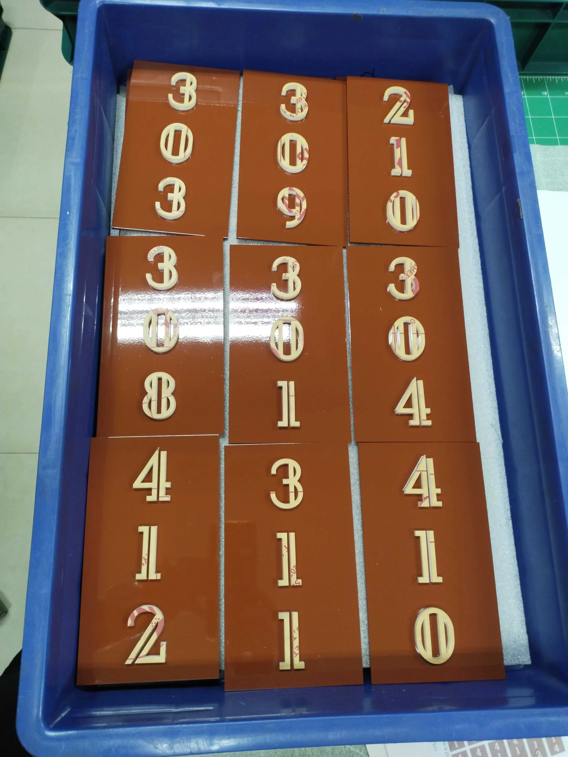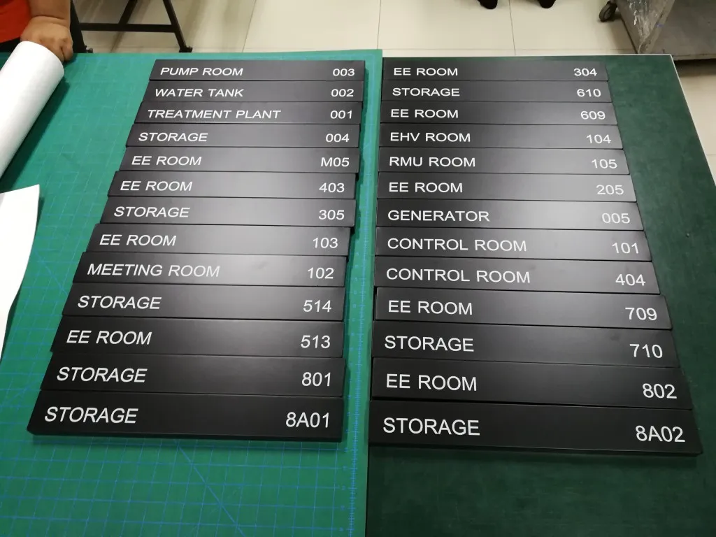 สำหรับหมายเลขห้อง, 15 x 30 ซม. สำหรับป้ายชื่อ และ 20 x 40 ซม. สำหรับป้ายบอกหน้าที่ นอกจากนี้ยังสามารถสั่งทำขนาดและรูปแบบพิเศษให้สอดคล้องกับข้อกำหนดอาคารหรือมาตรฐานแบรนด์ได้