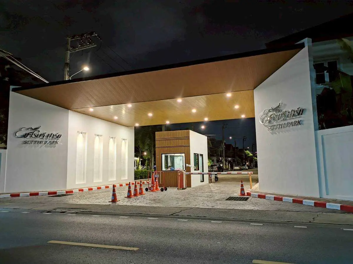 ป้ายขนาดใหญ่หน้าทางเข้าโครงการ แสดงชื่อโครงการและโลโก้ Developer อย่างโดดเด่น