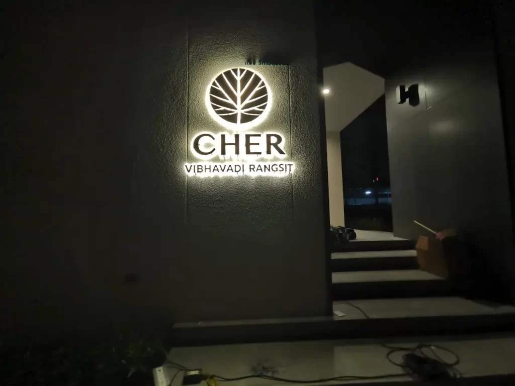 ผลิตและติดตั้ง ป้ายตัวอักษรไฟหน้าโครงการ 2 ฝั่ง พร้อมป้ายอลูมิเนียมคอมโพสิตแปะด้านหน้าด้วยตัวอักษรนูนสแตนเลส