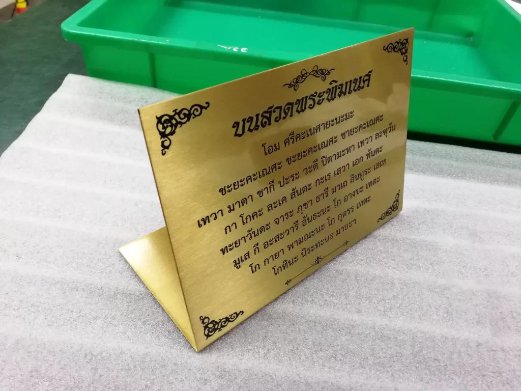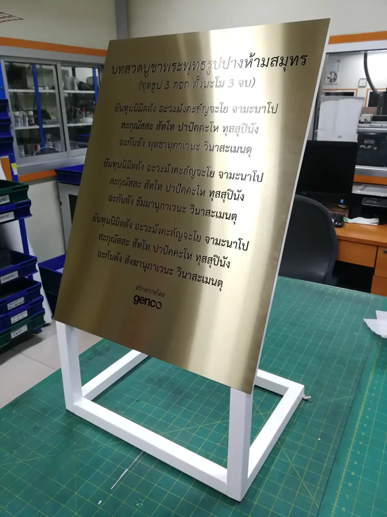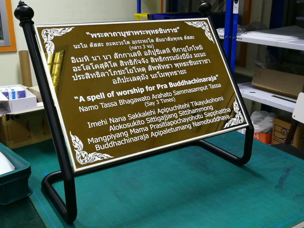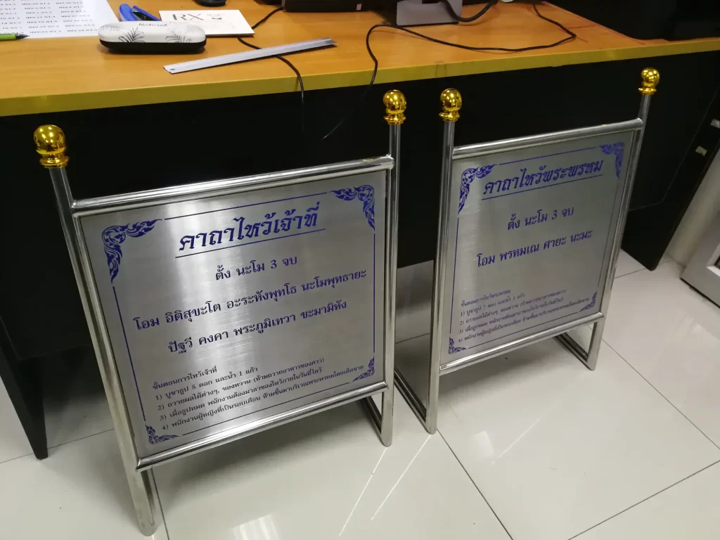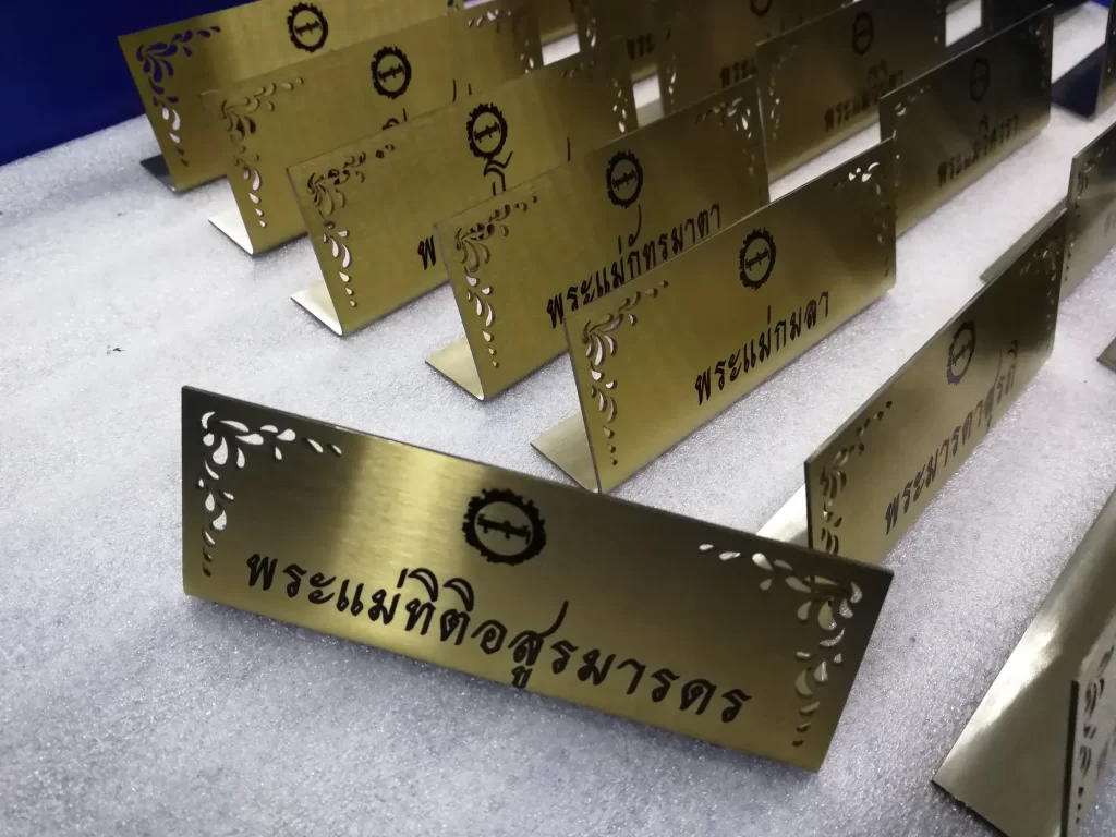 ป้ายตั้งโต๊ะที่ใช้สำหรับแสดงชื่อของพระพุทธรูปแต่ละองค์ ป้ายผลิตจากสแตนเลสกัดลายหรือตัดด้วยเลเซอร์อย่างประณีต แสดงความถึงความเคารพที่มีต่อท่าน