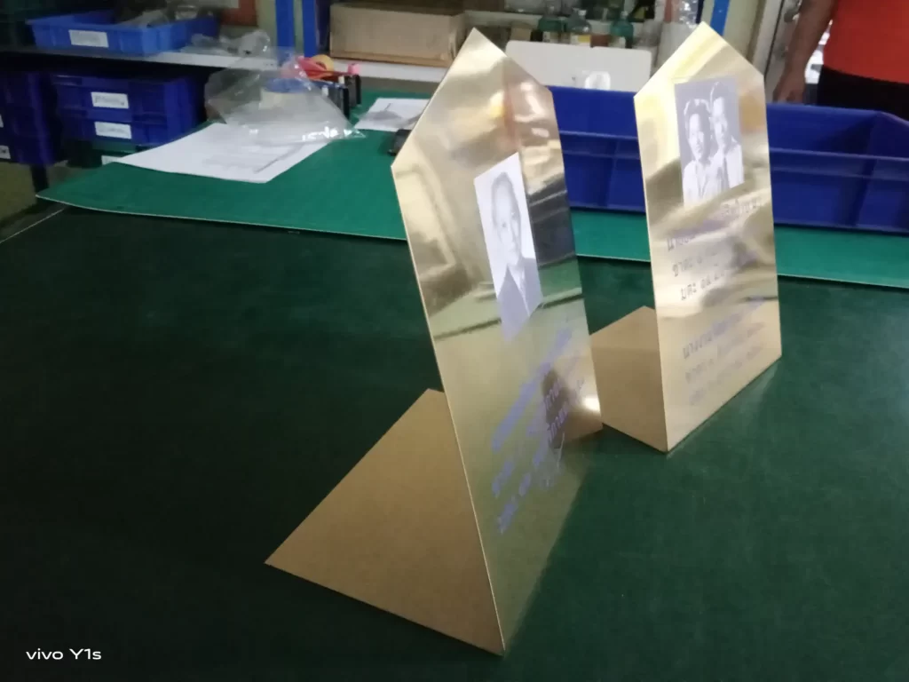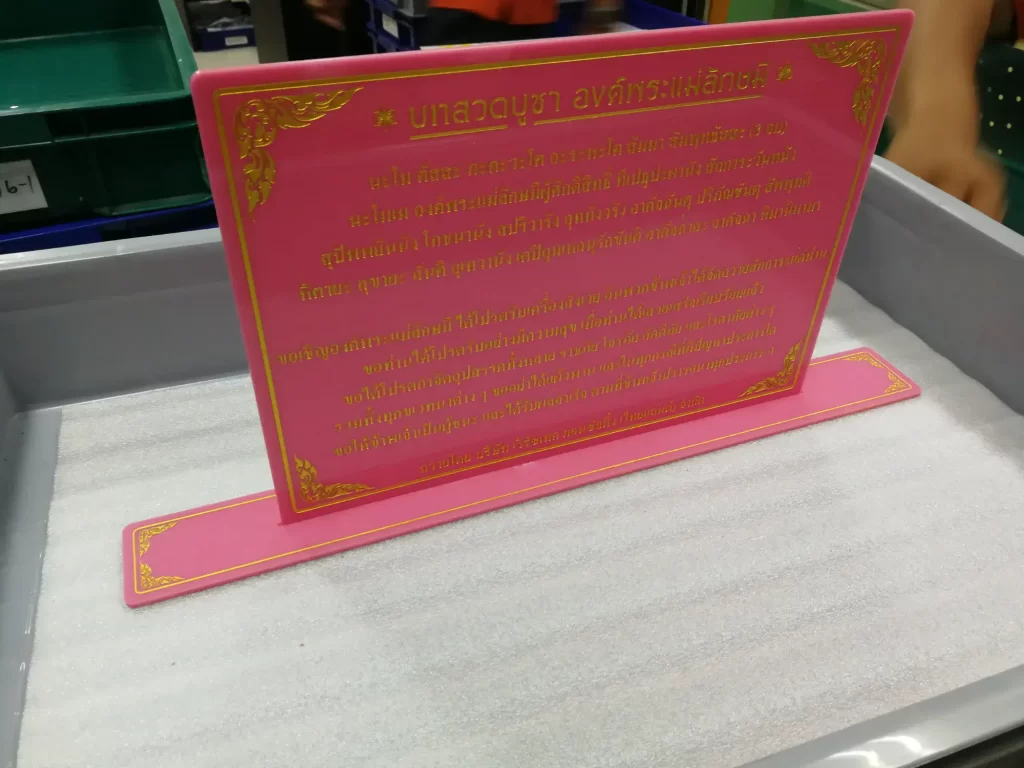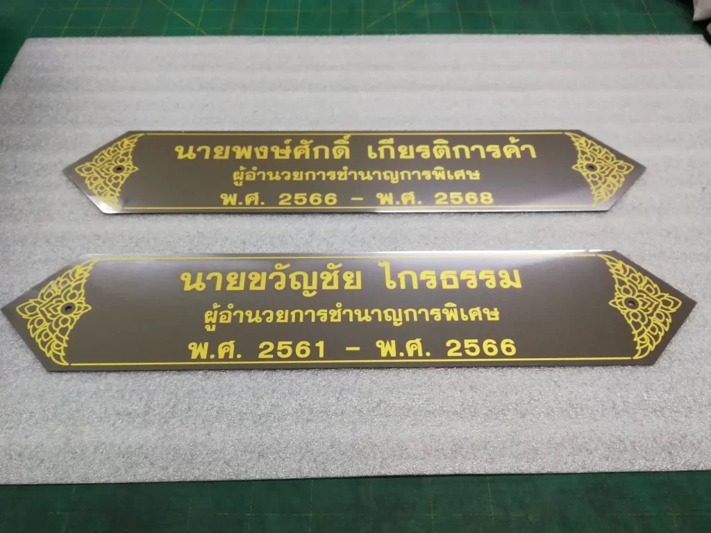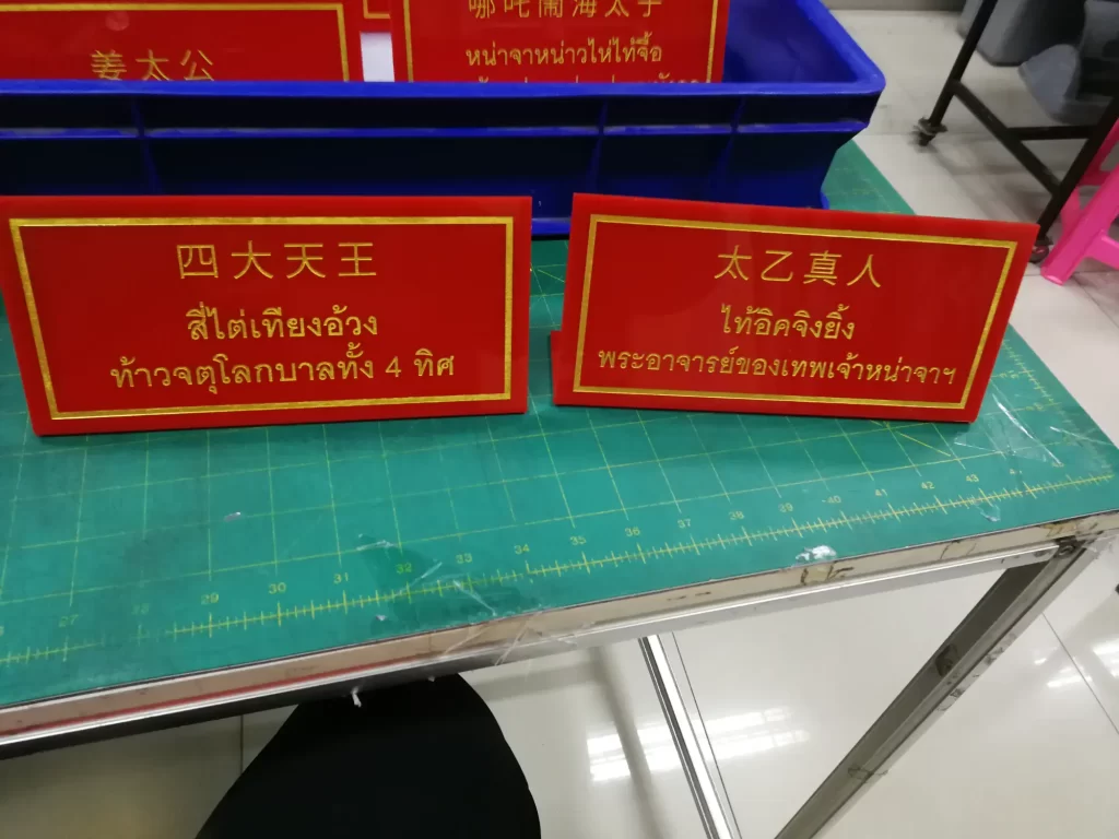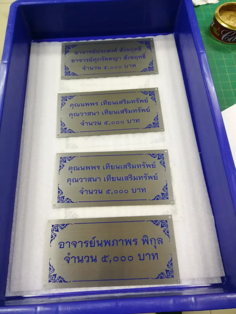 ป้ายตั้งโต๊ะที่ใช้สำหรับแสดงชื่อของพระพุทธรูปแต่ละองค์ ป้ายผลิตจากสแตนเลสกัดลายหรือตัดด้วยเลเซอร์อย่างประณีต แสดงความถึงความเคารพที่มีต่อท่าน